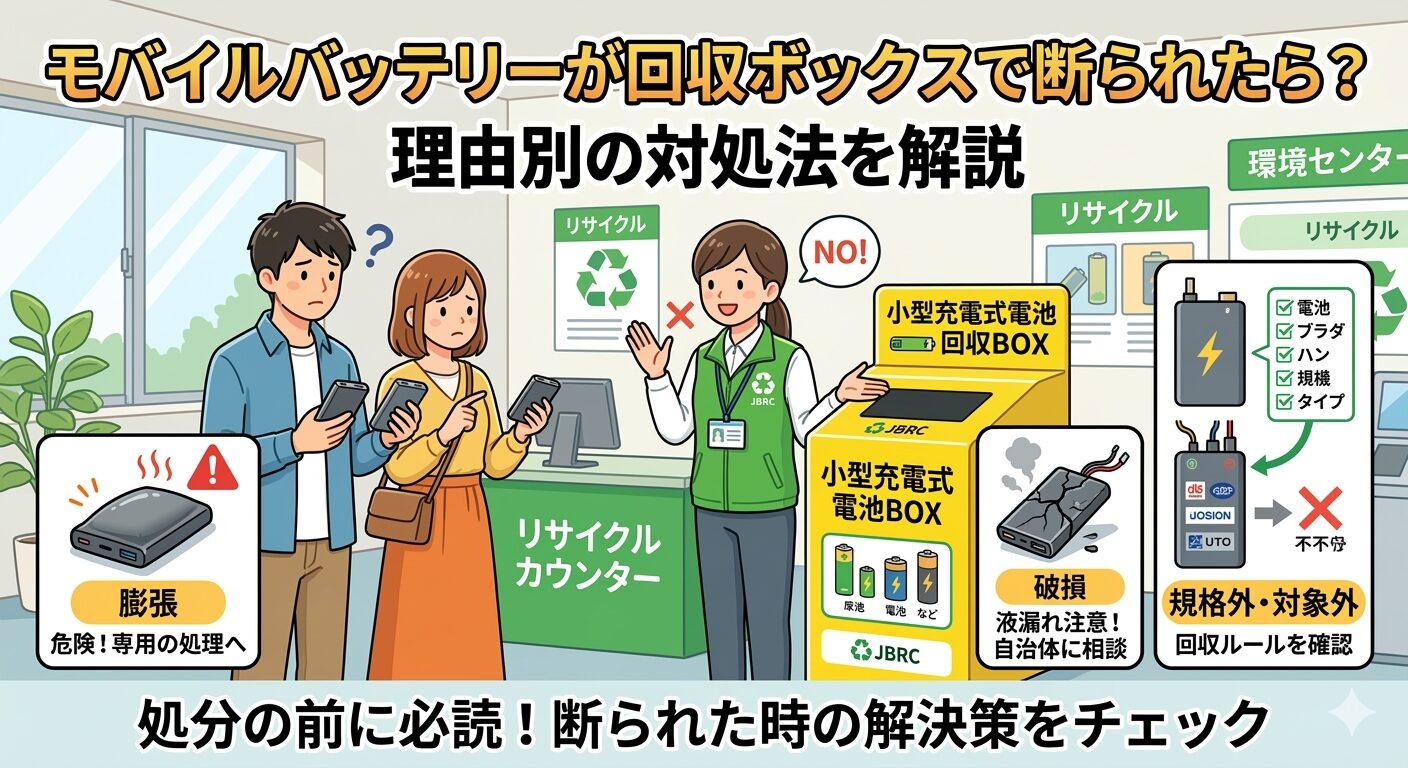 HOME > 回収不可・断られた > 回収不可・断られた 回収ボックスや店舗で「回収できません」と言われたときの解決ルートをまとめます。 断られる理由別に、次に取るべき手順(自治体・メーカー等)を案内します。
