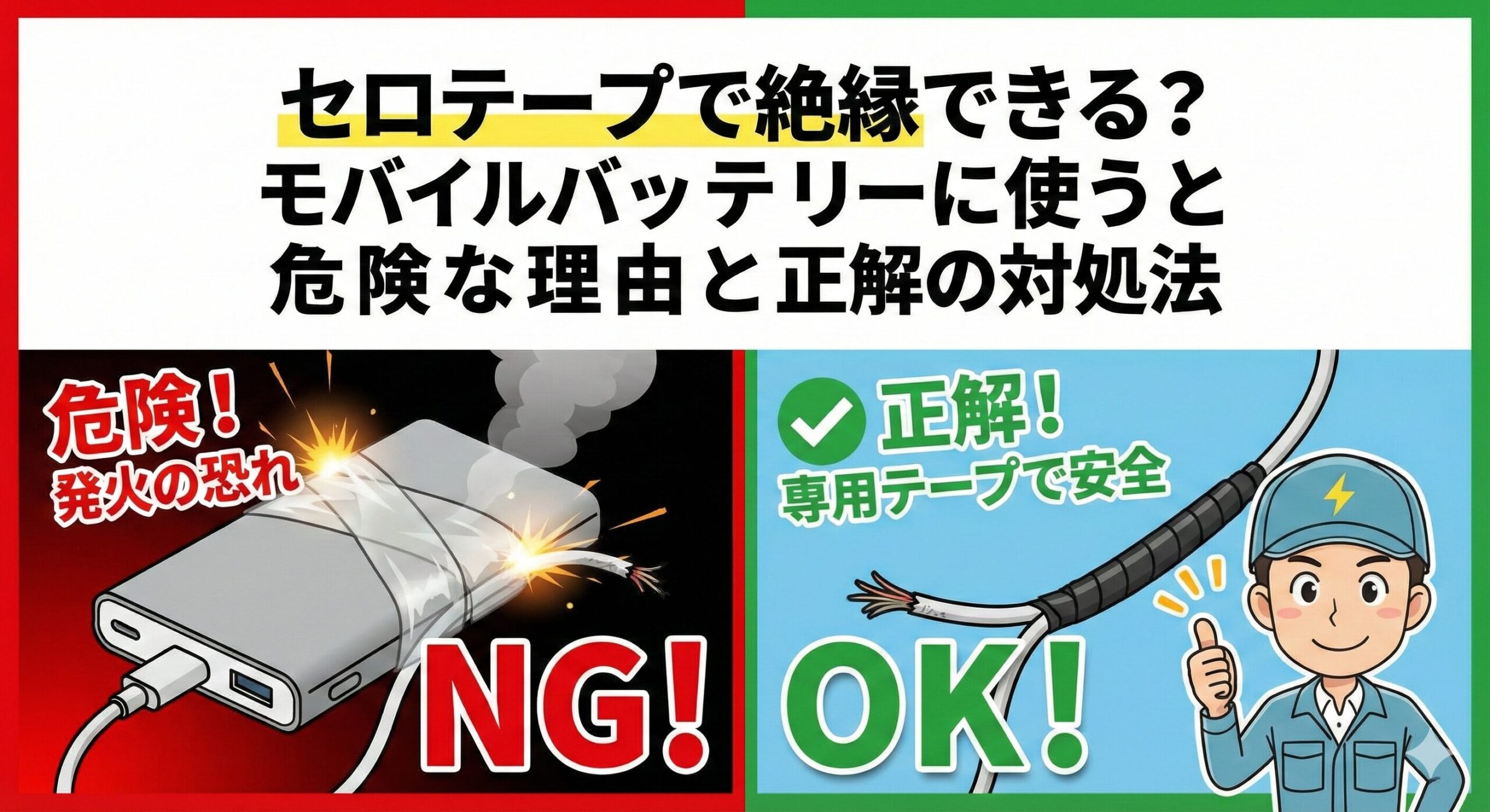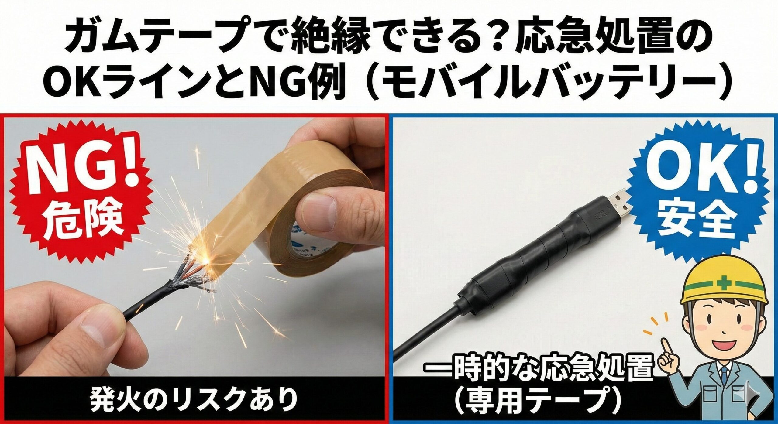 まずは端子が露出している部分に絶縁テープ。これだけで事故確率が下がります。