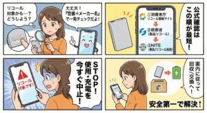 もしリコール対象だったら、使用・充電を中止して、案内に従って回収/交換へ進めてください。