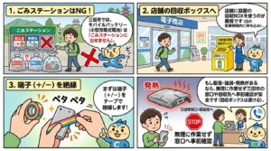 - 膨張・発熱・異臭:回収BOXに入れない → 事前確認して指示に従う