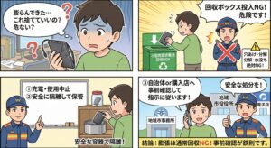 ※本記事は一般的な安全対策と情報整理です。回収可否・手順は自治体や回収先により異なります。必ず公式案内に従ってください。異常な発熱・煙・異臭がある場合は無理に扱わず、安全確保の上で自治体等へ相談してください。